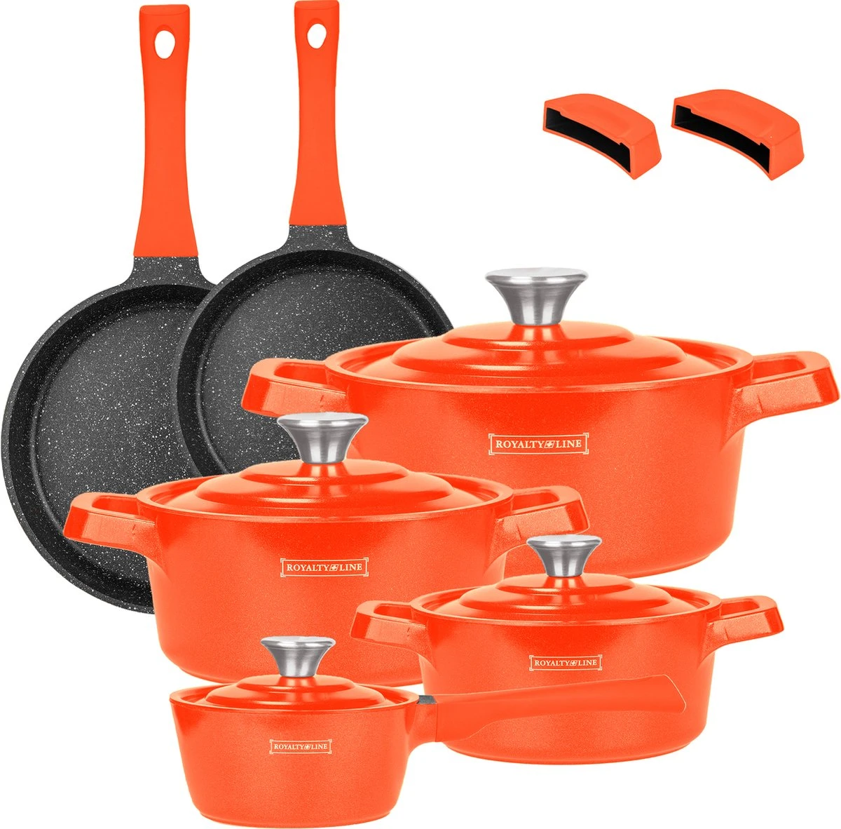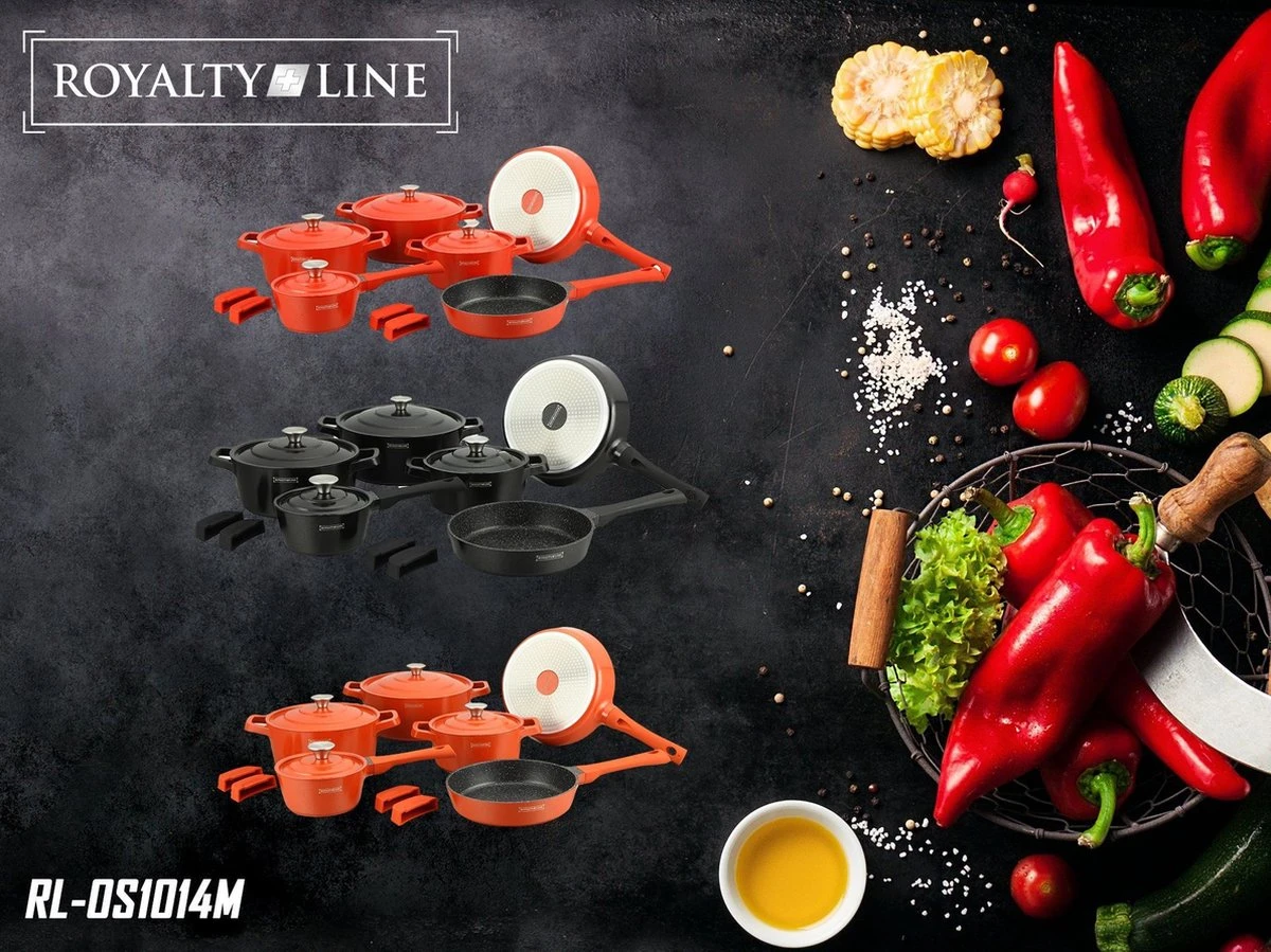 Royalty Line pannenset 14-delig met marmeren coating. Pannen zonder giftige stoffen, gemakkelijk schoon te maken en geschikt voor alle warmtebronnen.